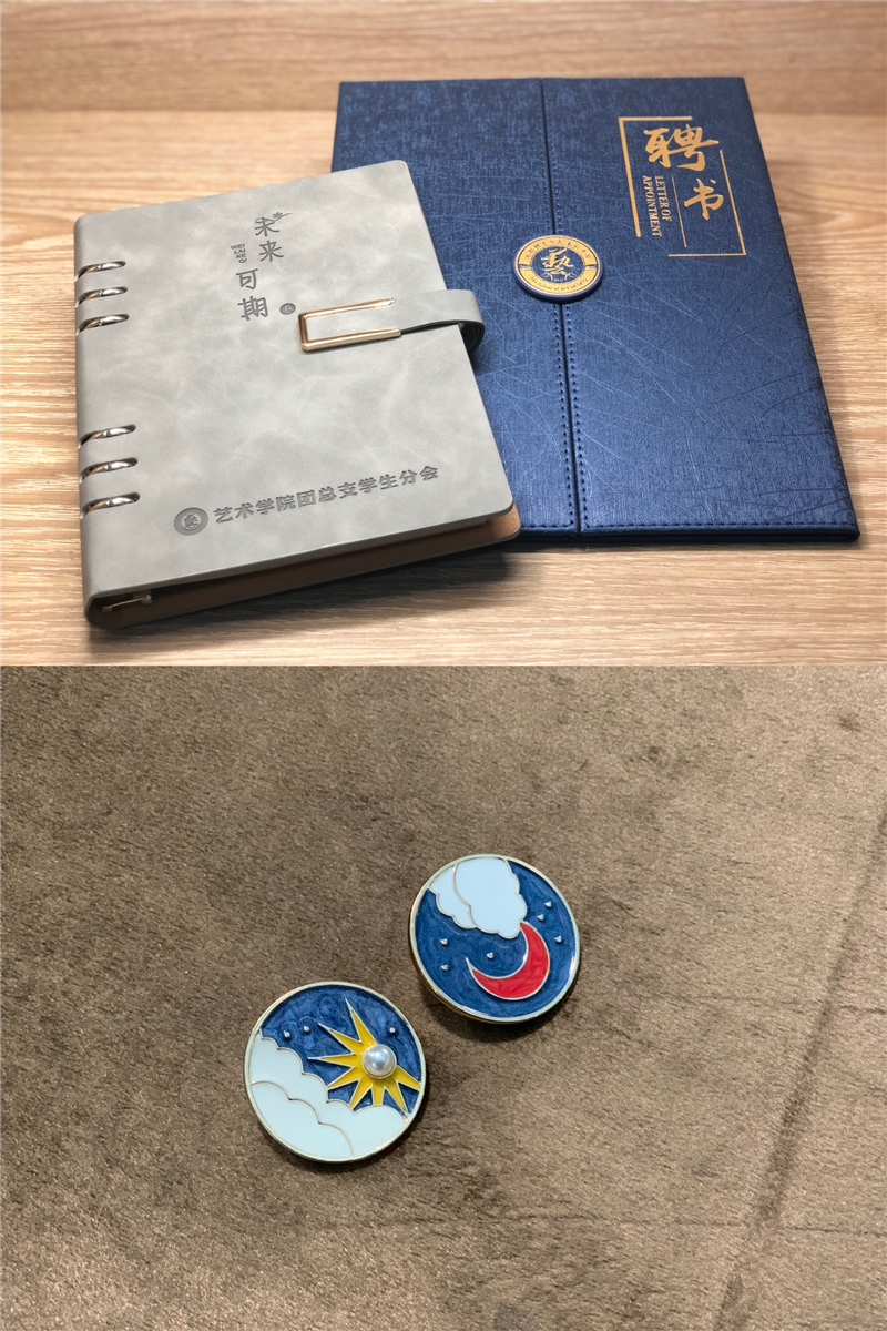 纳新传承仪式。第四届员工会干部为2021级新进成员佩戴员工会徽章,并赠送笔记本。边初阳同学讲解了员工会徽章的含义:太阳徽章(男生)象征着光明与温暖、征善的理念;月亮徽章(女生)象征着美好的未来、坚定的信念。寓意太阳与月亮一起前途一片光明。赠送笔记本,是希望新一届员工干部能养成做工作计划和工作笔记的好习惯。