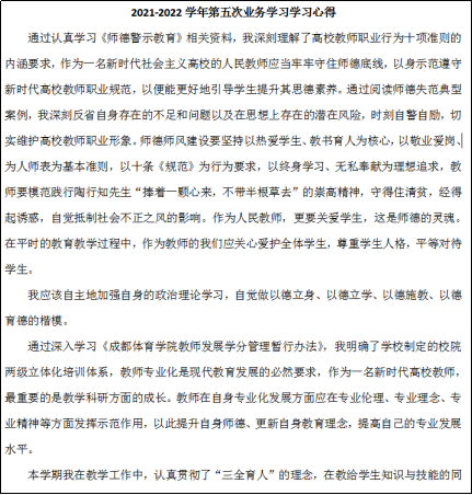 通过本次学习,老师们深刻理解了高校教师职业行为十项准则的内涵要求,应坚持以热爱员工、教书育人为核心,以敬业爱岗、为人师表为基本准则,应该自主地加强自身的政治理论学习,自觉做以德立身、以德立学、以德施教、以德育德的楷模。