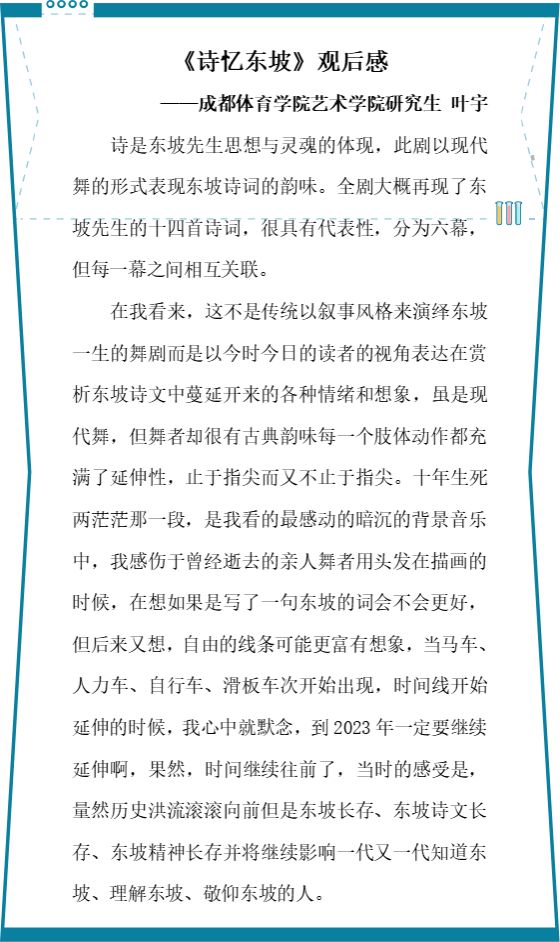 本次观摩不仅是一次舞台先锋作品的艺术体验,是对中华优秀传统文化的全新感悟,更是对东坡精神的赞美与弘扬。作为新时代的文艺工作者,在创作方面应进一步打开视野、拓宽思路,融合文化和多元思维,为中华文化的传承与创新贡献力量。